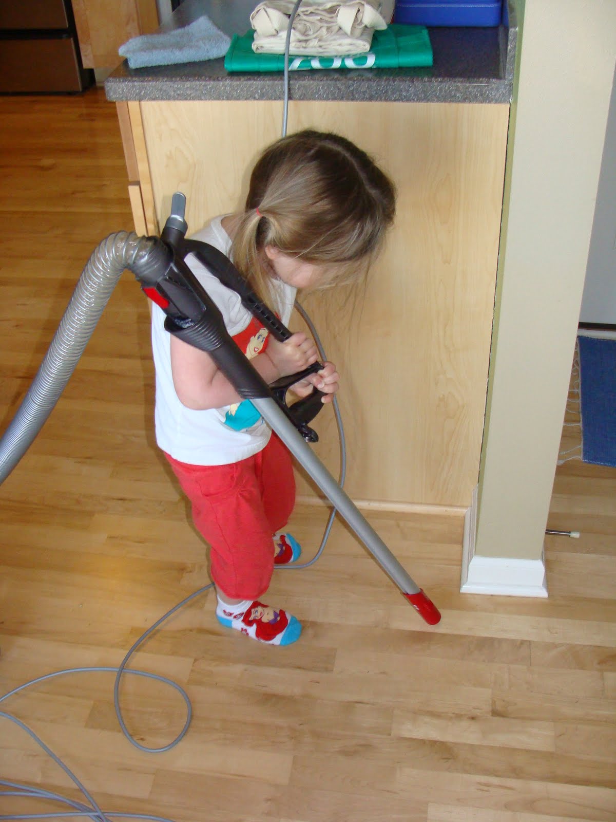 madelyn likes the vacuum cleaner and now we know that mason does too. matt was cleaning the bathroom and madelyn had been helping him, but then he wanted me to give her another task. after baking some cookies (before you get too impressed it was just refrigerated rounds, but madelyn thought that it was fun), i started vacuuming up crumbs from under the table because mason is now a scavenger - he is always hungry.and then i put madelyn to work. i gave her the extension (i don't know what else to call it) and sent her hunting for